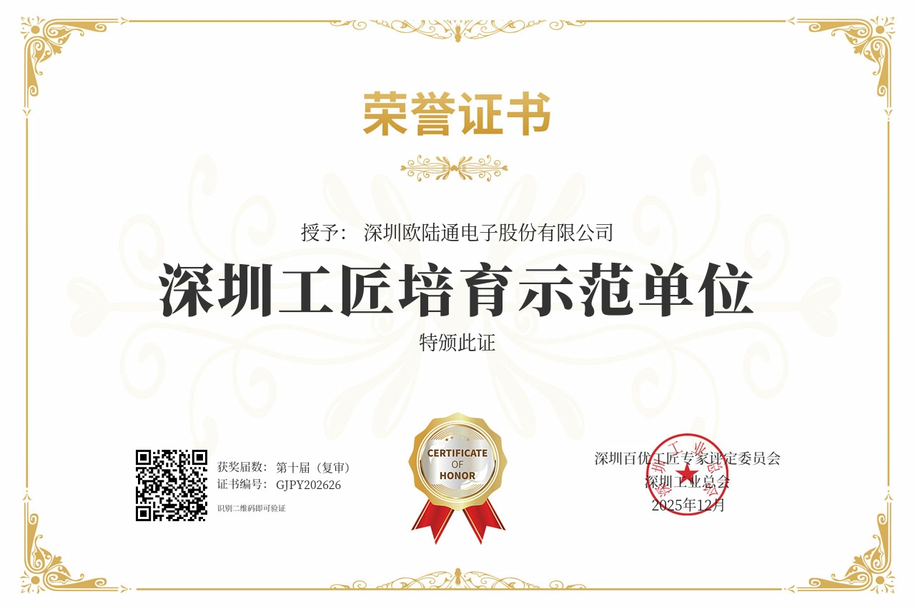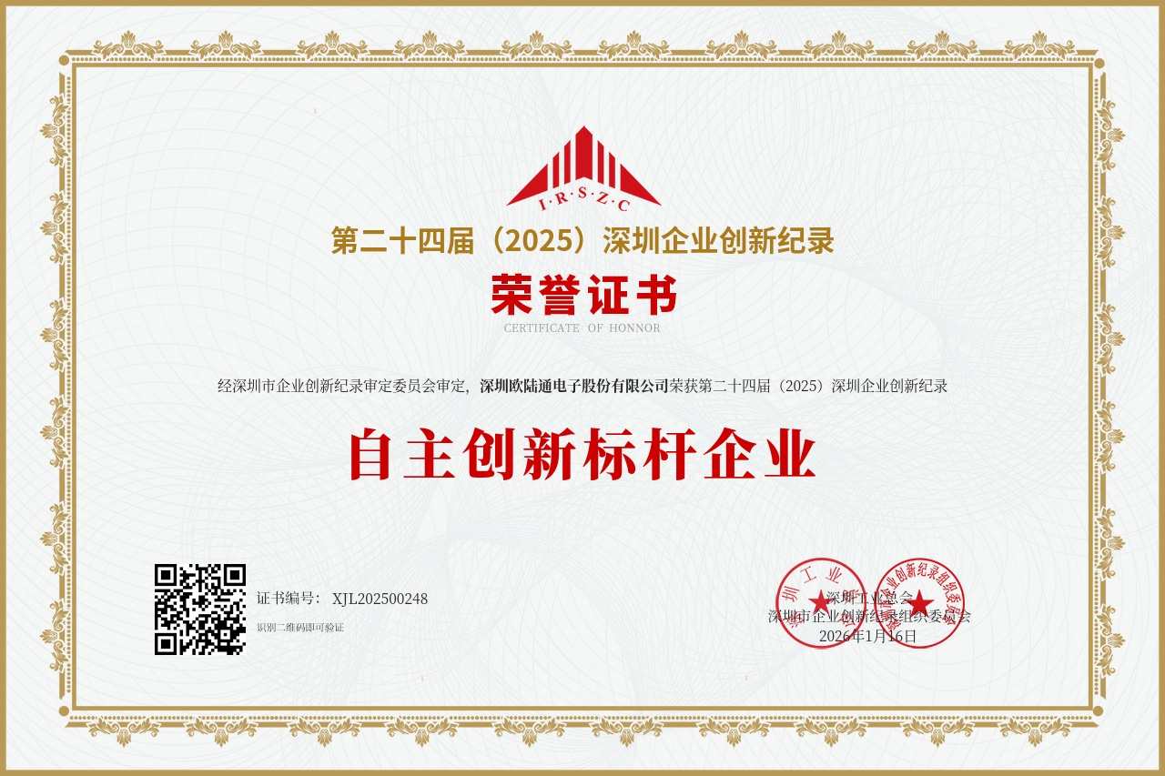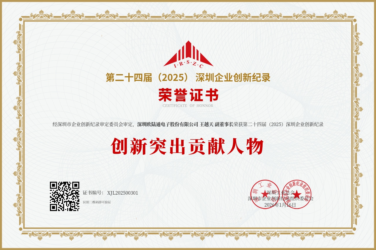 憑借在技術(shù)創(chuàng)新、區(qū)域產(chǎn)業(yè)引領(lǐng)、社會(huì)責(zé)任踐行等維度的綜合表現(xiàn),歐陸通一舉斬獲九項(xiàng)大獎(jiǎng)。歐陸通入選“2025粵港澳大灣區(qū)企業(yè)創(chuàng)新力榜單-創(chuàng)新成就榜”,榮獲“深圳工匠培育示范單位”、“2025年度履行社會(huì)責(zé)任杰出企業(yè)”、“第二十四屆深圳企業(yè)創(chuàng)新紀(jì)錄-自主創(chuàng)新標(biāo)桿企業(yè)”獎(jiǎng)以及兩項(xiàng)“第二十四屆深圳企業(yè)創(chuàng)新(中國)紀(jì)錄”;歐陸通董事長兼總經(jīng)理王合球先生,榮獲“2025年度履行社會(huì)責(zé)任杰出人物”;歐陸通副董事長王越天先生,入選“2025粵港澳大灣區(qū)企業(yè)創(chuàng)新力榜單-創(chuàng)新杰出人物榜”,榮獲“第二十四屆深圳企業(yè)創(chuàng)新紀(jì)錄-創(chuàng)新突出貢獻(xiàn)人物”。